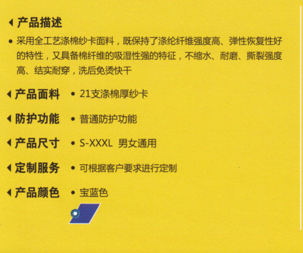 采用全工藝滌棉紗卡面料,既保持了滌綸纖維強度高、彈性恢復性好的特性,又具備棉纖維的吸濕性強的特征,不縮水、耐磨、撕裂強度高、結實耐穿、洗后免燙快干